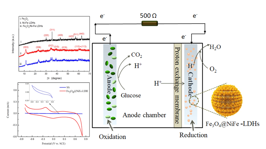 该研究采以NiFe-LDH为金属源,Fe3O4为载体基质,在层状双金属氢氧化物(LDH)中掺入氮,制备了一种纳米级核壳结构催化剂(Fe3O4@NiFe-LDH),提升了单室微生物染料电池阴极的催化性能,进而提升MFC产能输出。