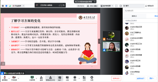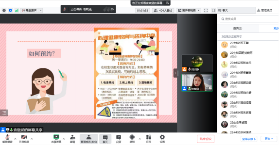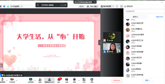 通过腾讯会议成功举办2022级新生入学教育之大学生心理健康专题讲座。学院心理辅导员袁晓涵为新生带来了题为《大学生活,从“心”开始》的报告,报告会由2022级辅导员刘文静主持,2022级全体新生参加了本次报告会。