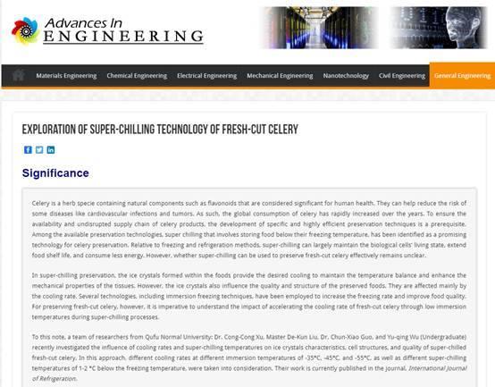 许丛丛副教授团队关于鲜切芹菜微冻技术的研究论文被国际工程领域著名科技机构Advances in Engineering(AIE)遴选为关键科学文章,并于2020年12月1日进行报道。该研究得到国家自然科学基金项目资助。