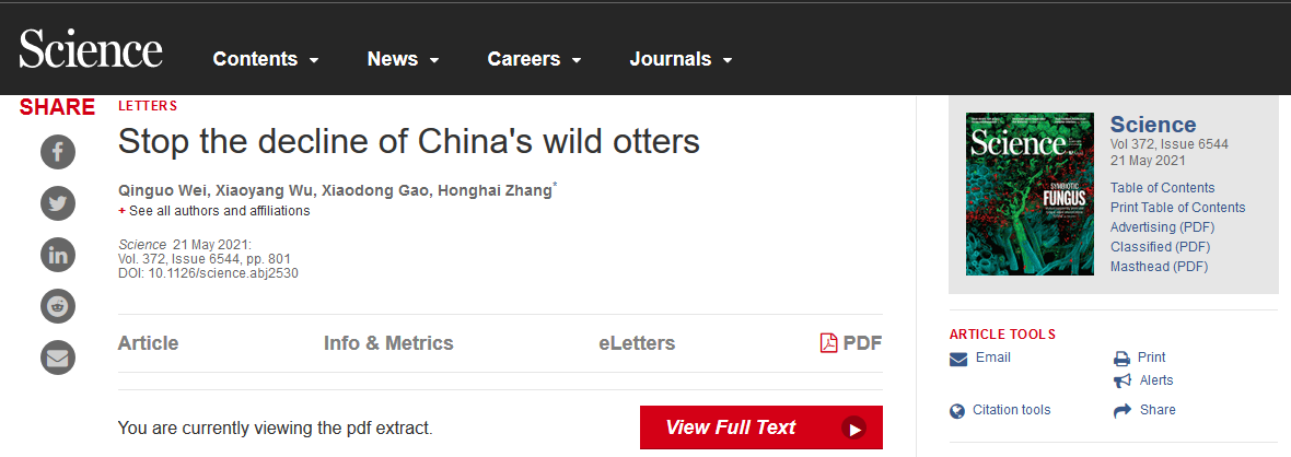 “Stop the decline of China's wild otters”一文于5月21日在Science(科学)杂志发表, 张洪海为通讯作者,其团队成员、51动漫