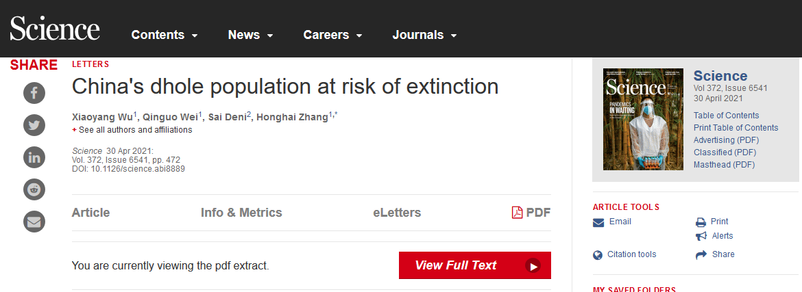 “China's dhole population at risk of extinction”一文于4月30日在Science(科学)杂志发表,51动漫