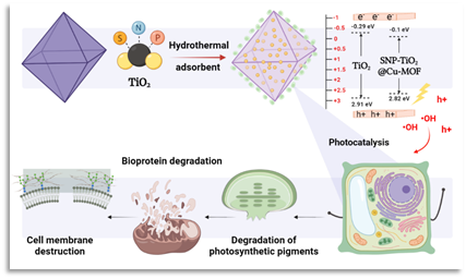 由于富营养化现象频发,有害藻类水体处理问题一直受到广泛关注,不同于传统处理方法的费时费力、处理周期长等缺点,光催化灭活有害藻类已经成为一种非常有潜力的有害藻类水体处理方法。光催化技术不仅可以在短时间内大量灭活藻细胞,还可同步高效降解有害藻类在代谢过程中产生的各种藻毒素,而金属有机框架材料(MOF)由于具有巨大的比表面积,高孔隙率,开放的金属位点等特殊性能,有广泛的研究前景。该研究在前期制备的可见光光催化剂SNP-TiO2的基础之上,将其负载在Cu基金属有机骨架(Cu-MOF)正八面体的表面,成功制备了SNP-TiO2@Cu-MOF复合材料,并在可见光下对赤潮微藻米氏凯伦藻进行灭活探究。SNP-TiO2@Cu-MOF复合材料的带隙为2.82 eV,在可见光区有较强的光吸收,是介孔类吸附材料,具有245.2972 m2/g的高比表面积。SNP-TiO2@Cu-MOF表现出很强的光催化杀藻活性,当暴露浓度为100 mg/L,暴露时间为6 h时,对米氏凯伦藻的可见光光催化灭活效率为93.75%,细胞失活使膜通透性增加,光合色素和主要生命蛋白被降解,抗氧化系统产生氧化应激而实现的。该研究表明,SNP-TiO2@Cu-MOF复合材料在治理有害藻类方面具有很大的研究潜力和应用前景。