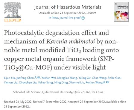 2020级生态学硕士研究生胡丽君题为 “Photocatalytic degradation effect and mechanism of Karenia mikimotoi by non-noble metal modified TiO2 loading onto copper metal organic framework (SNP-TiO2@Cu-MOF) under visible light”的文章,王仁君教授、陈峻峰副教授为该论文通讯作者。Journal of Hazardous Materials是中科院SCI一区Top期刊(环境科学与生态学),影响因子(IF2021)为14.224。这是胡丽君继以第一作者在Science of The Total Environment(SCI二区TOP期刊,影响因子10.753)和Environmental Science and Pollution Research(SCI三区,影响因子5.190)发表论文后的第三篇论文。