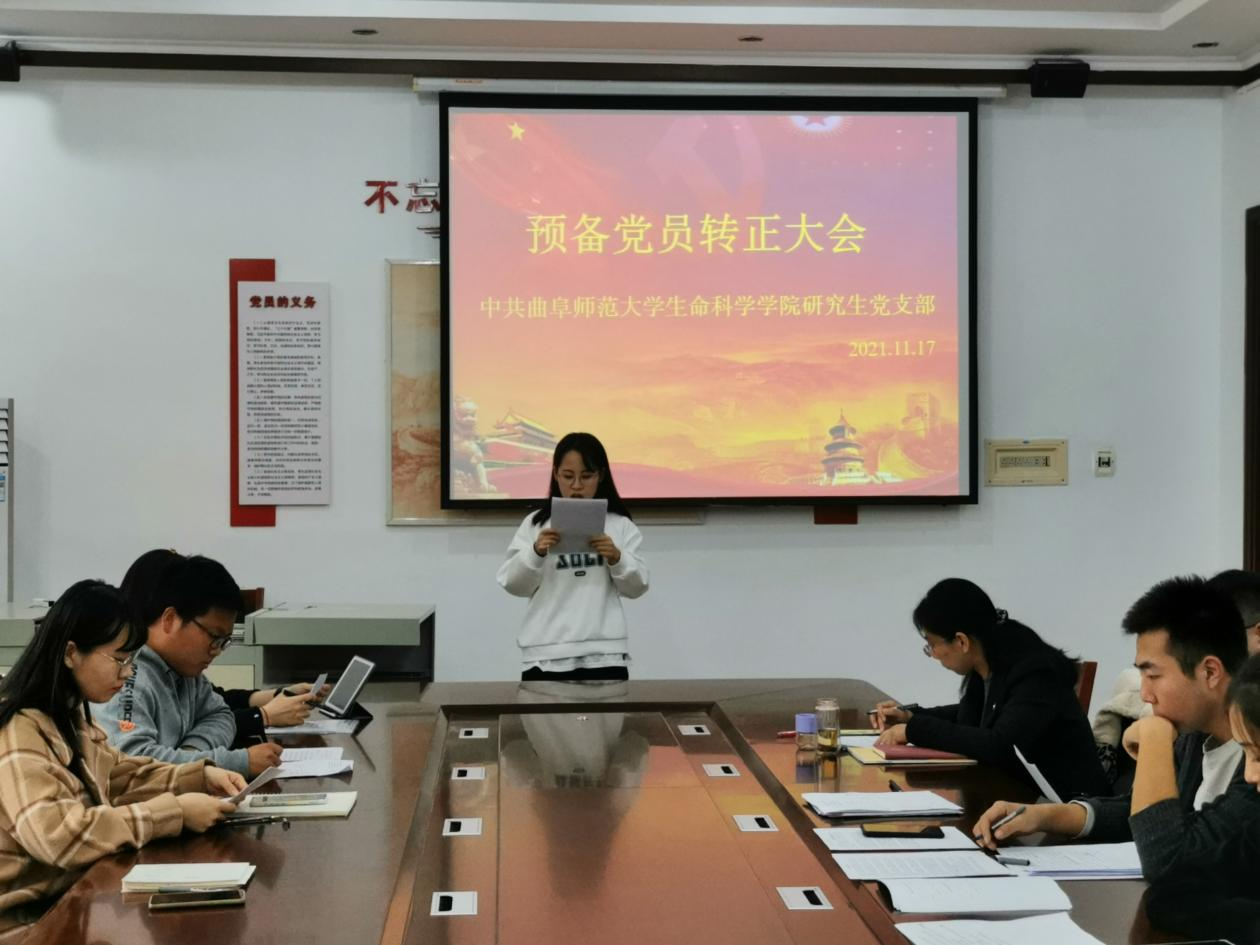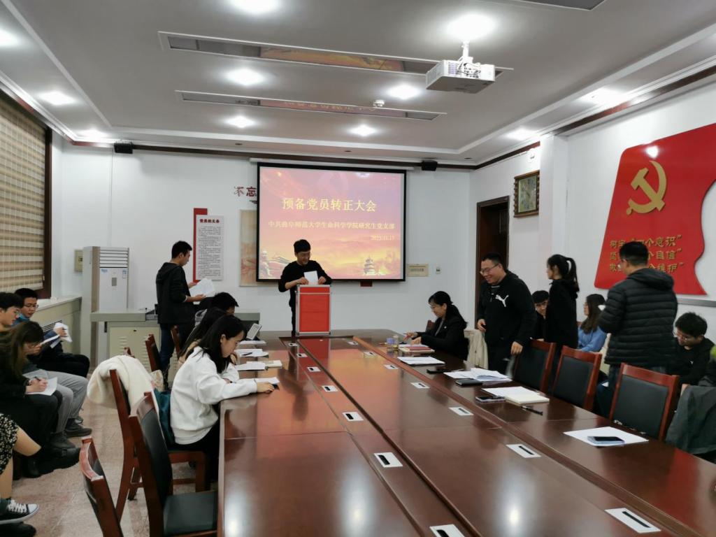 研究生党支部于2021年11月17日晚在生物楼208室召开预备党员转正支部大会。会议由党支部书记燕艳同志主持,全体研究生党员参加。