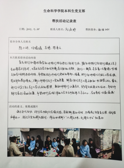 此次活动是我支部落实党史学习教育的一项重要工作,也是党员为群众办实事的一项重要举措。此次帮扶活动的开展,搭建了党支部与新生的沟通平台,提高了新生向党组织靠拢的积极性,为学生党建工作的开展奠定了良好的基础。同时,党员同志深刻体会并明确如何才能真正做到全心全意为人民服务,从自身做起,更好地履职尽责,发挥好党员的先锋模范作用。