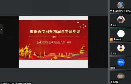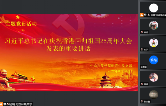 为庆祝香港回归祖国25周年,激励党员大力弘扬伟大建党精神,凝聚强大奋进力量, 7月7日上午,研究生党支部组织开展庆祝香港回归25周年线上主题党日活动,一同学习“习近平总书记在庆祝香港回归祖国25周年暨香港特别行政区第六届政府就职典礼上发表的重要讲话”。会议由研究生党支部书记燕艳主持,全体研究生党员参加。