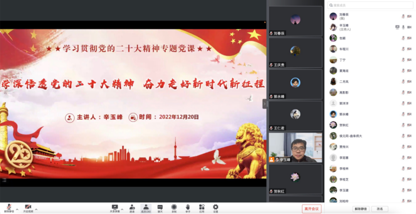 中国共产党第二十次全国代表大会于10月16日至22日在北京举行。这是在全党全国各族人民迈上全面建设社会主义现代化国家新征程、向第二个百年奋斗目标进军的关键时刻召开的一次十分重要的大会,是一次高举旗帜、凝聚力量、团结奋进的大会。为了全面学习宣传贯彻党的二十大精神和学校第九次代表大会精神,2022年12月20日晚,生科院教工党支部通过线上腾讯会议的形式开展了主题党日活动,本次活动以支部书记讲党课的形式开展。支部书记辛玉峰以“学深悟透党的二十大精神奋力走好新时代新征程”为题面向全体党员全面宣传党的二十大精神。