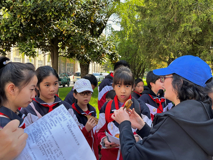 活动过程中,小学生们在各位老师的带领下,认识了多种校园植物,仔细观察了植物的特征,了解了植物名字的来历及其价值。在老师绘声绘色的描述下,同学们听的特别认真,并且能表达自己对植物的理解和感受。小朋友们亲眼观察,亲手触碰植物的叶、花、果实等,对植物产生更深刻的印象。在桃李园,他们在老师的引导下,对各种树木的树皮进行了拓印,亲身实践,感悟了自然之美。最后,全体师生来到51动漫