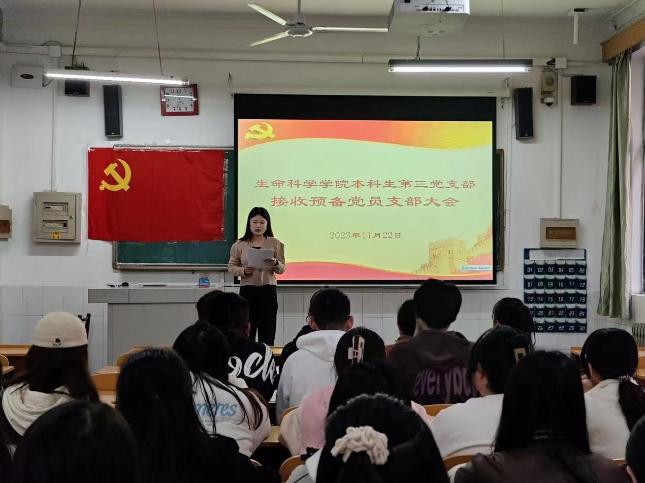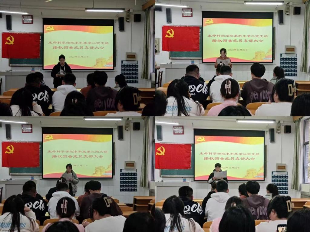 本科生第三党支部于生物楼233室召开接收预备党员支部大会,审议曹龙海、徐梦萱等4名同志接收为预备党员的相关事宜。本次会议由第三党支部书记袁晓涵同志主持。