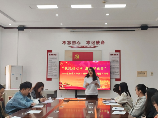 为深入学习领会习近平总书记关于加强党的作风建设的重要论述,全面落实中央八项规定及其实施细则精神,切实增强学生党员的党纪意识和规矩意识,3月25日下午,学院研究生第二党支部在208会议室开展了“深入贯彻中央八项规定精神学习教育”启动仪式暨“党纪铭心中,廉洁伴我行”主题党日活动,活动由研究生第二党支部书记郭春晓主持,支部全体党员参加。
