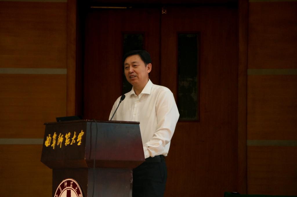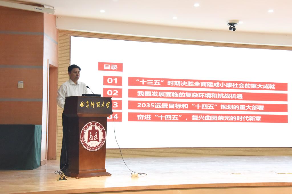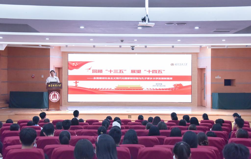 张洪海围绕“全面建设社会主义现代化国家新征程与孔子家乡大学发展新篇章”这一主题,从“十三五”时期决胜全面建成小康社会的重大成就、新发展阶段我国面临的复杂环境和机遇挑战、2035远景目标和“十四五”规划的重大部署、复兴曲园荣光的时代新章等四个层面,与同学们一起回顾“十三五”,展望“十四五”,引导同学们深刻认识和理解党中央对于我国将进入新发展阶段的重大判断,加深了同学们对国家和学校“十四五”规划的了解,引导同学们树立爱党爱国、爱校荣校的行动自觉。同时,张洪海向同学们提出殷切期望,号召青年学生深入学习领会十九届五中全会精神的核心要义和精神实质,学以致用、知行合一,既要做实现中华民族伟大复兴历史进程的见证者,更应成为这一历程的参与者、推动者、创造者,奋进“十四五”,建功新征程。
