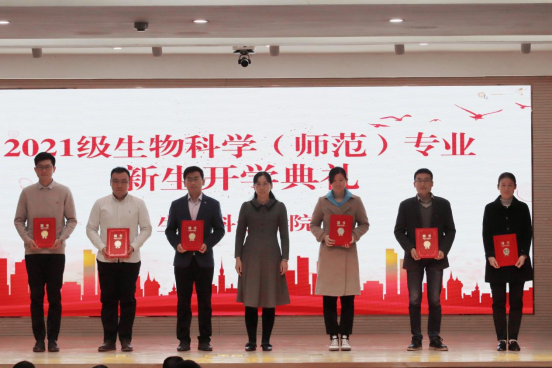 随后,院党委书记李志广为新生授予校徽院旗,增进了新生爱校荣院的情怀,激发了他们“知院、爱院、兴院”的自豪感、荣誉感和责任感。紧接着,典礼上为2021级生物科学(师范)专业班主任颁发了聘书。
