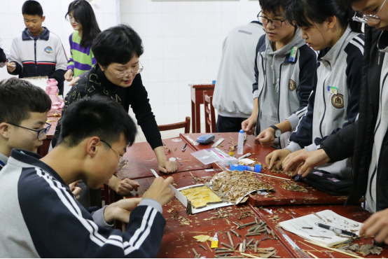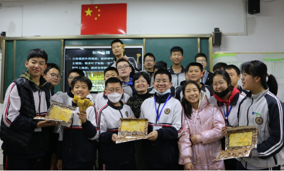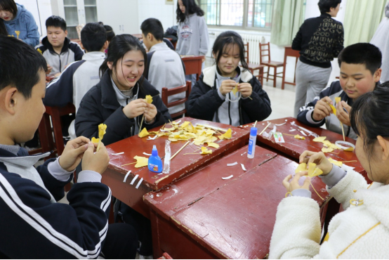 学生的帮助与讲解下,同学们以小组为单位制作落叶作品,在集思广益、并付诸实践的过程中进一步加深了对植物学知识的认识,同时也提高了团队协作能力。一番努力创作后,作品很快有了雏形,同学们从动手操作中获得了乐趣,同时也收获了成就感,课堂氛围十分火热,教室里充满了欢声笑语。
