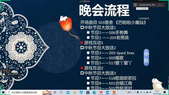 在浓厚的中秋节日氛围中,学院还组织开展了“云”中秋喜乐会,以宿舍为单位亮相晚会,同学们各显神通,有舞蹈串烧、歌曲联唱、钢琴演奏、诗朗诵等,节目内容精彩纷呈,欢呼声尖叫声此起彼伏,抽奖环节更是妙趣横生、惊喜满满。大家在晚会柔美的音乐和曼妙的舞蹈中围坐畅谈,共同度过了一个花好月圆的中秋夜。