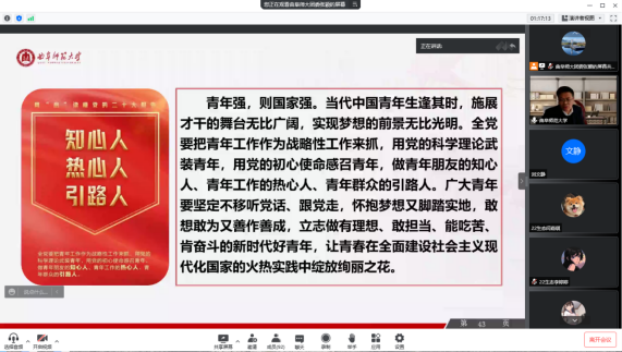 领导班子、辅导员、2022级生物科学一班学生、部分学生代表线上参会学习。