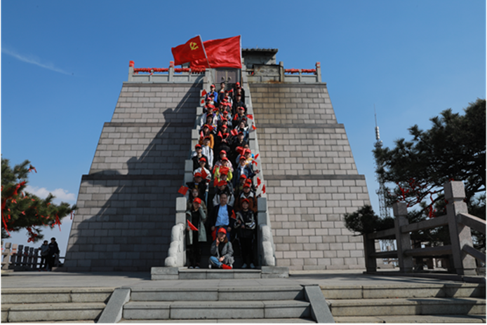 51名师生乘车前往蒙山红色教育实践基地开展红色教育实践活动,全体师生登上龟蒙顶,参观了沂蒙山720电视转播台旧址,聆听讲解员讲述关于沂蒙山720转播台的发展纪实和革命前辈为此奋斗的历史,大家驻足在旧址前凝视,回视抗日战争和解放战争中浴血奋战的历程,真切感受沂蒙人民踊跃支前、无私奉献的伟大精神。全体师生还在龟蒙顶进行“快闪”歌唱活动,大家放声歌唱,用自己最饱满的热情赞颂祖国,一曲《我和我的祖国》唱出了同学们满心的自豪与敬爱,在嘹亮的歌声中,师生们一起回忆那段峥嵘岁月,感佩早期革命党人的丰功伟绩。最后,全体师生在蒙山前以党徽标志进行合影留念。