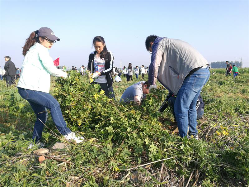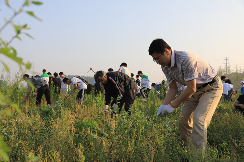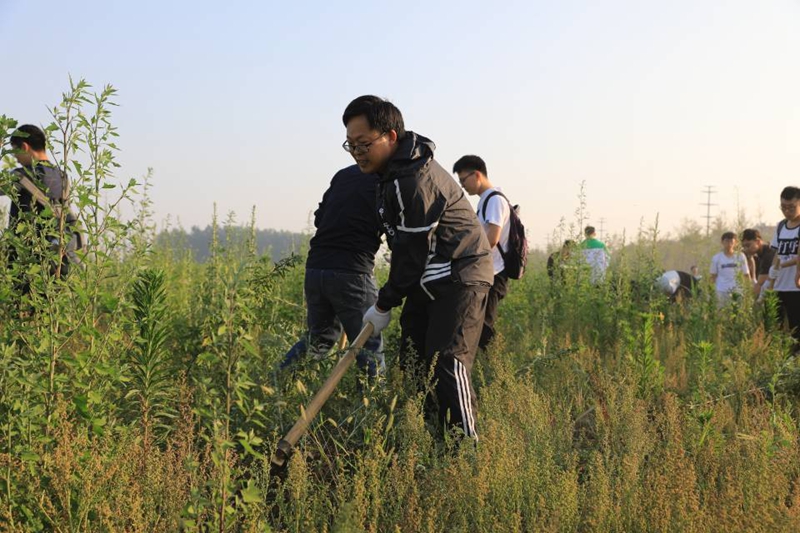 活动从早晨6点开始,参与活动的所有成员按照要求在规定时间到达指定地点。整齐的队伍显示出生科学子昂扬向上的精神风貌,面对杂草丛生的场地,同学们不但没有退缩,反而表现出了高昂的热情。所有人被分为八个小组,在老师的带领下,认真积极的参与除草活动。活动开始前,老师向同学们教授了除草工具的使用方法,并再三叮嘱同学注意安全,还细心的为同学们准备了防蚊虫叮咬剂。老师们以身作则,同学们奋勇争先,少许时间便清理出一大片空地。学生们还借此机会认真的向老师请教关于植物学的各种专业知识,和老师探讨大学生活中的各种感悟体会,现场气氛融洽而热烈。尽管顶着炎炎烈日,但同学们的脸上都洋溢着劳动后的快乐与满足。