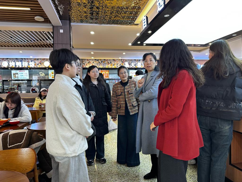 在食堂,与同学们共进午餐,了解饮食等日常生活情况,叮嘱大家加强锻炼、健康饮食。