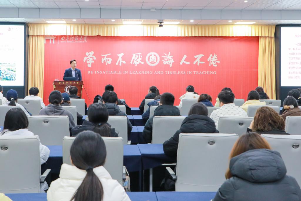张洪海从经济实力、文化建设等多个方面系统梳理了国家和省“十四五”期间的发展成就,从学科实力、教育教学成果、科研实力、文化“两创”、开放办学、办学条件、优秀校友等方面详细介绍了曲阜师大在“十四五”期间取得的跨越式突破。他强调,国家和山东省“十四五”发展成就源于“五个坚持”的宝贵经验,曲阜师大取得的丰硕成果得益于始终坚持“顶天立地”的发展思路。最后,张洪海结合生科学子专业特点,以青头潜鸭研究团队为例,讲述了团队通过科研实践服务国家野生动物动物保护,生动诠释学校办学理念向实践成果的转化。站在“十四五”收官、“十五五”开启的历史节点,张洪海勉励同学们以曲园积淀为舟,以时代潮流为桨,在实验室里求真知,在田野调查中察民情,真正将个人理想融入国家发展,将专业知识转化为实践行动,让青春在服务国家战略与人类进步的篇章中熠熠生辉!