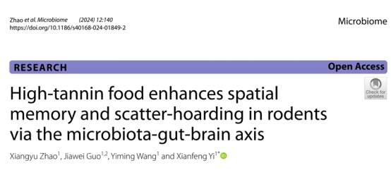 近日,我院易现峰教授团队在协同进化与适应研究领域取得了重要进展,相关研究成果以“High-tannin food enhances spatial memory and scatter-hoarding in rodents via the microbiota-gut-brain axis”为题发表在Microbiome上。Microbiome是微生物领域的国际权威期刊, 最新IF=13.8, 五年IF=17.9,被SCI(中科院大类和小类双一区)数据库收录。