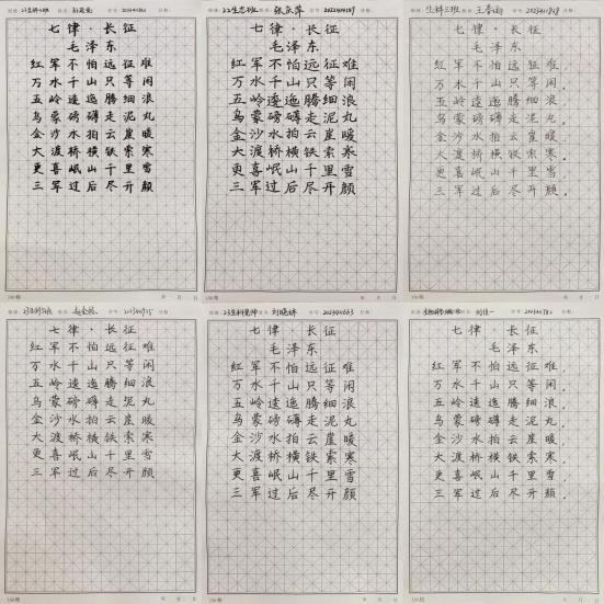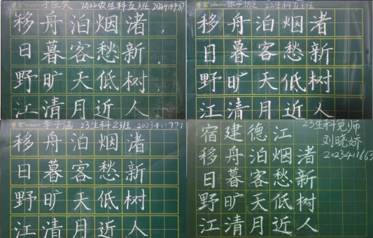 2023级、2022级全体同学,分为师范生和非师范生两个组别,每组有钢笔字、毛笔字、粉笔字三类。比赛过程中,参赛选手们握笔的手稳定而有力,墨水在纸上流淌,一笔一画都认真而谨慎。有的选手笔走龙蛇,字体苍劲有力;有的选手则笔法细腻,字体娟秀雅致。作品中每一笔都是选手们优秀师范能力的展现,每一划都承载着教师书写技能的千锤百炼。一幅幅作品都凝聚着选手们过去的辛勤与汗水,彰显了选手们优秀的从师技能和对教师职业的崇敬与向往。
