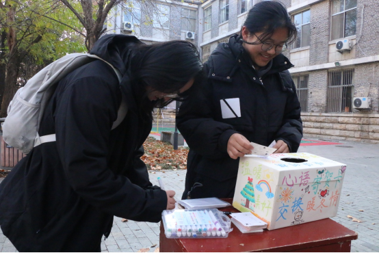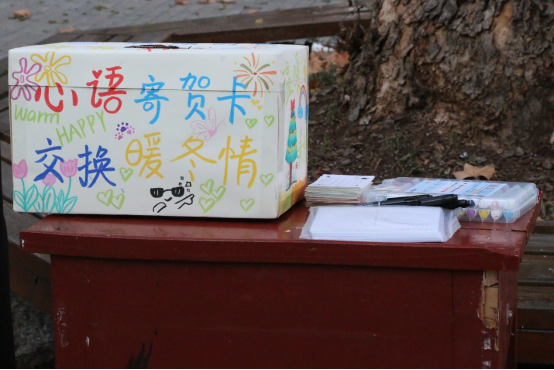 本次的活动以线下方式进行。活动举办前期,由工作人员布置场地并熟悉工作流程,将贺卡、贺卡箱、彩笔、剪刀和胶水等道具准备齐全。随后,参与者在工作人员的热情引导下,抽取贺卡箱中的贺卡,并将自己的温暖和创意写在贺卡上,放入贺卡箱中供其他参与者抽取。在活动过程中,有人抽取贺卡,绽放笑容;有人写下贺卡,传递暖冬祝福。无论是对远方亲友的思念,还是对身边同学的感恩,都能借由一张精心挑选或亲手制作的贺卡得以倾诉,现场气氛温馨又充满感染力。活动最后,工作人员对活动场地进行了清洁整理并拍摄集体合照,本次活动圆满结束。