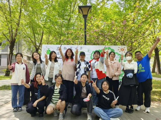 工作人员在活动开始前完成策划及前期准备工作,同时借助社交媒体进行宣传。全校师生以及来访校友共同在学院后花园展开以春为主题的绘画接力活动,画笔在每个人手中飞舞,用一笔一划画出独属于曲园人的美好春天。画板上点点泼墨是春之感悟,自由而洒脱;勾勒的斑斓图画,定格春之美好。历经三小时,春之画卷绘制作完毕,部分参与此次活动的师生及工作人员共同合影留念,将这份春日美好放置于后花园进行展览。本次活动圆满结束。