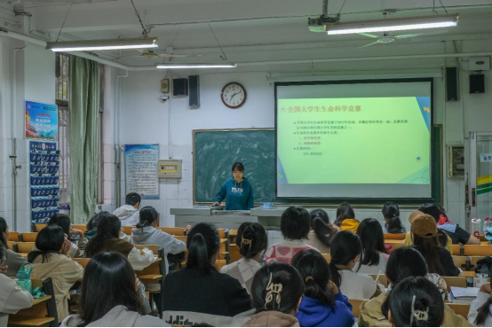 学生会科技创新部部长从“双创教育背景与意义”“双创品牌活动简介”“双创教育激励政策”等三个方面进行讲解。随后介绍了生科院学生可参加的A类、B类学科竞赛项目和学校相关奖励政策,引导同学们早进实验室、早进课题组、早进科研团队,积极投身创新创业活动,全面提升个人创新实践能力。