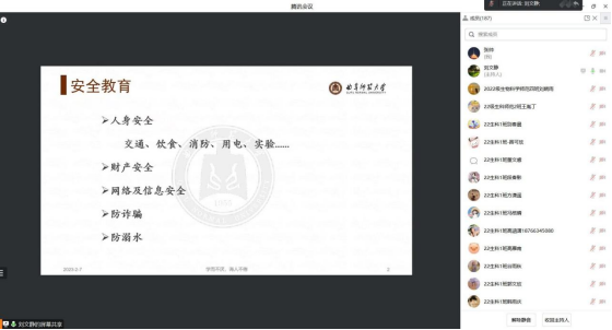 为做好2023年春季学期学生开学返校工作,提升学生的安全意识和自护自救能力,营造安全、和谐、稳定、健康的校园生活环境。2月7日,学院各班通过腾讯会议线上平台召开开学返校前的安全教育主题班会,加强安全教育,保证学生安全有序返校。