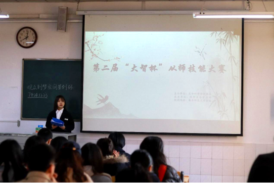学生综合素质的提高,提升师范生教学素养。2月26日,第二届“大智杯”从师技能大赛院级比赛于生物楼332教室举行,学院本科生参与了本次活动徐金会、周晶、甘延东三位老师担任本次比赛的评委。