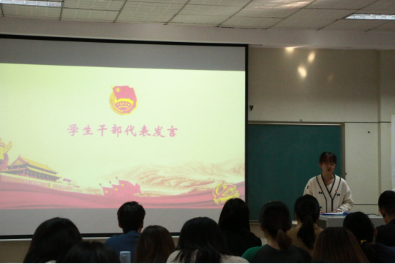 团委副书记刘蓉作为学生干部代表进行发言,我们要牢记重托、不负历史使命,在学习中进步,在实践中成长,在奉献中升华是对‘青年马克思主义者’的深度诠释,更是我们作为新时代学生骨干所肩负的不可推卸的责任。