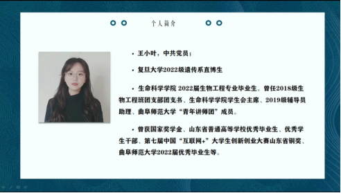 王小叶针对生物工程专业进行专业阐释,分析了生物工程专业的专业特点和就业前景,让新生同学对于本专业有了更为深刻的认识。随后,王小叶将新生课程的具体安排,分享了个人学习规划,指导新生如何适应大学学习方式。最后,王小叶结合大学期间取得的成绩和自身经历,解答了考研就业选择、推免保研等同学们感兴趣的问题,鼓励新生同学们要提高专业认同感和建立学习兴趣,将兴趣化为动力,为民族复兴贡献青年力量。