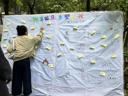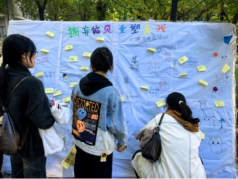 活动前期,工作人员精心布置场地,备齐彩笔、便利贴等物料,并熟悉各环节流程。现场设有核心互动区,背景板上预先贴满各类贬义标签。在工作人员的引导下,参与者认真查看标签内容,划去困扰自身的负面词汇,并在空白处书写积极话语,覆盖原有标签。活动中,同学们或写下激励语句为自己加油,或与同伴共同许下心愿、播撒希望,或绘出生动简笔画传递温暖。现场气氛热烈,洋溢着青春活力。