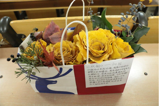 在生物楼128教室成功举办“秋叶片片,创意翩翩”落叶设计大赛。比赛由学生会副主席刘畅、贺斯喆,党建学生工作部部长马慧真、宣传部部长武静雯担任评委。