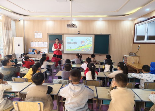 活动在“诗词猜果蔬”互动游戏中拉开序幕。当志愿者念出“绿绿的外皮,藏着清甜果肉”的谜面时,孩子们瞬间雀跃起来——有的高举小手、身体前倾,生怕错过发言机会;有的迫不及待跑向教室前方,大声喊出“西红柿”;还有的三五成群低声讨论,兴奋地抢答“草莓”。尽管答案与“西瓜”“甜瓜”等标准答案不尽相同,但童言稚语中尽显天真想象,引得现场欢笑不断,课堂氛围轻松而热烈。