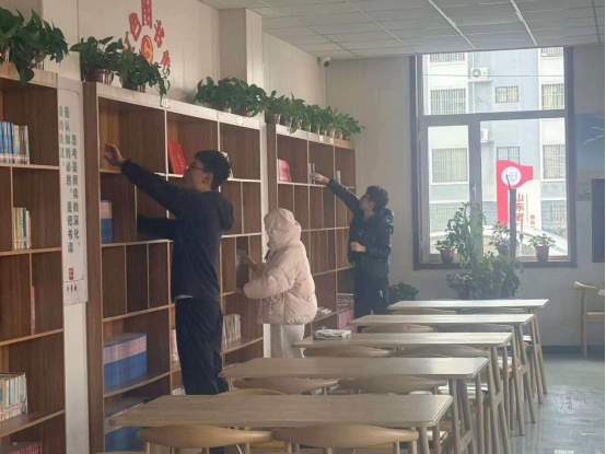 活动中,志愿者们分工明确、高效协作。规范图书管理,补写模糊脱落的分类标识,将千余册散置书籍按文学、科普、农技等类别归架对齐,同步登记破损图书待修。优化空间环境,用消毒湿巾擦拭阅览桌椅边角扶手,清扫地面并细致清理书架缝隙、窗台浮尘,为绿植浇水除尘。完善细节服务,整理归档散乱书签与借阅登记本,让阅读空间更显温馨。最终,图书馆面貌焕然一新——图书分类清晰、排架整齐,阅览区桌椅洁净、地面光亮,绿植生机盎然,原本杂乱的空间变为规整温馨的阅读阵地。