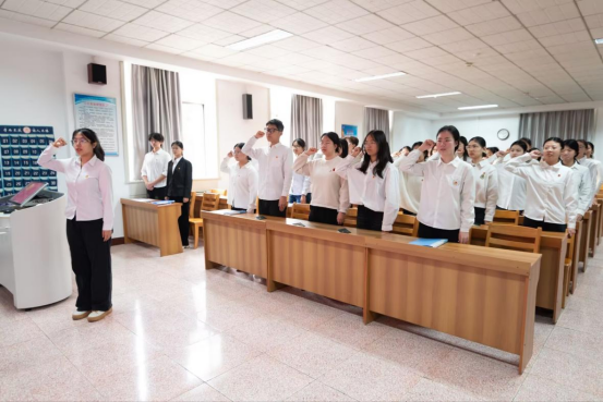 接下来,王鑫晗同志带领全体新团员面向团旗,庄严宣誓。誓言铿锵,展现了新时代青年听党话、跟党走的坚定决心。随后,团委副书记施雨薇宣读了《团章》中关于团员权利与义务的条款,勉励新团员勤奋学习、积极奉献。