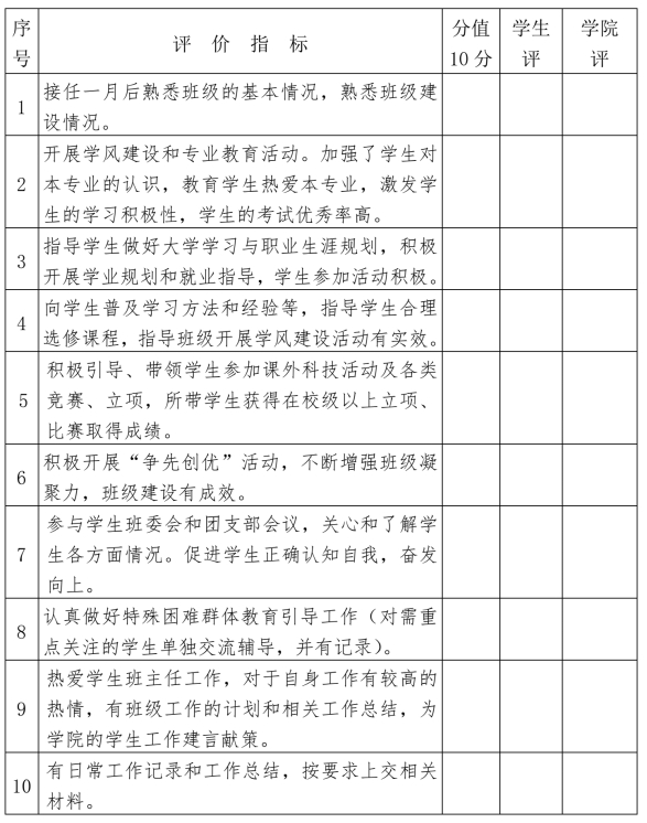 1.学院对班主任每学期考核一次,每学年进行一次评定。两个学期的考核结果的平均值为年度考核结果。