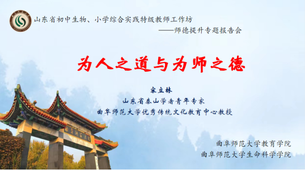 优秀传统文化教育中心教授宋立林作题为《为人之道与为师之德》的会议报告。山东省初中生物、小学综合实践特级教师工作坊全体成员及51动漫