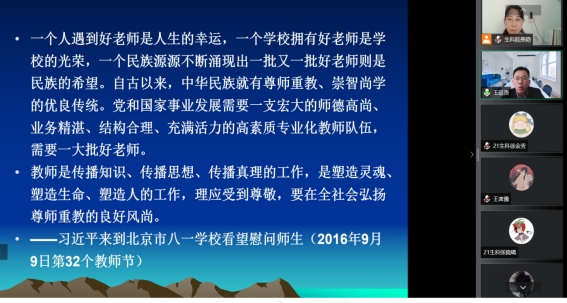 教学基本功是技术加艺术的体现,是教师从事教育教学工作必须具备的最基本的职业技能。随着课程改革的深入推进,课程改革理念逐渐深入人心。为了贯彻新课改的教学理念,造就一支思想品德过硬、业务素质精、教学基本功强的中学生物学师资队伍,学院于2022年4月8日,邀山东省教育科学研究院基础教育研究所所长王运贵做题为《新课改背景下中学生物学教师需具备的基本功》的线上讲座。院长助理燕艳主持讲座,生物科学专业师范生及学科教学(生物)专业研究生参加了本次讲座。